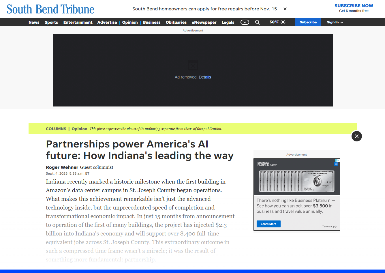 Amazon op-ed in the South Bend Tribune speaking to local partnerships, Indiana leading the way in AI: